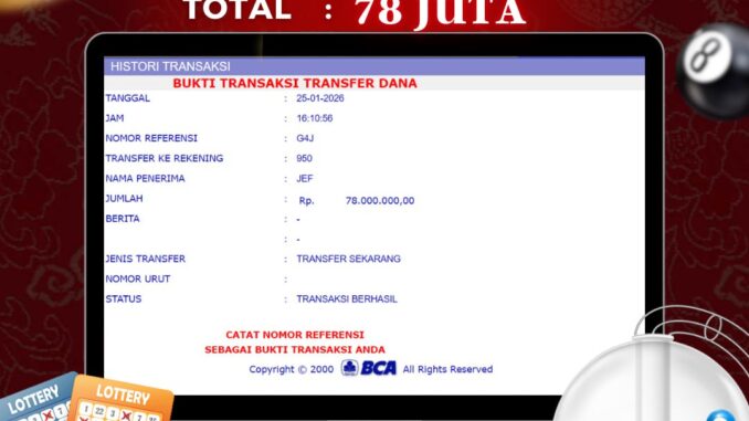NAGA303 mengucapkan selamat kepada user id : WIN*** yang telah berhasil mendapatkan jackpot pada permainan TOGEL DI TOTO MACAU 4D. Kemenangan sebesar Rp 78.000.000,-. telah dibayarkan LUNAS oleh pihak naga303 kepada pemilik user id setelah yang bersangkutan mengisi formulir withdraw. Proses pencairan dana berlangsung sangat cepat hanya dalam waktu 6-11 menit sudah berada dalam rekening pemilik user id. Bukti transfer yang dapat anda lihat adalah bukti SAH / VALID yang langsung di dapatkan melalui bukti transaksi dari Bank yang digunakan untuk pengiriman dana pada rekening pemilik user id. Terima kasih kami sampaikan kepada para pengguna setia naga303 yang telah menggunakan situs kami, sebagai Bandar Terpercaya yang pastinya membayar semua kemenangan member hingga lunas. Apakah Naga303 PENIPU ? Reputasi “NAGA303 TERPERCAYA” sudah sangat melekat. puluhan hingga ratusan ribu pengguna setia NAGA303 tetap menggunakan situs terbesar dan terbaik di Indonesia ini. Hapus rasa was-was dan khawatir anda, kemenangan anda berapapun PASTI dibayarkan hingga lunas.