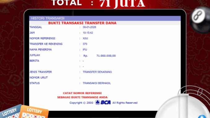 NAGA303 mengucapkan selamat kepada user id : BEK*** yang telah berhasil mendapatkan jackpot pada permainan TOGEL DI AMAZON 3D. Kemenangan sebesar Rp 71.000.000,-. telah dibayarkan LUNAS oleh pihak naga303 kepada pemilik user id setelah yang bersangkutan mengisi formulir withdraw. Proses pencairan dana berlangsung sangat cepat hanya dalam waktu 6-11 menit sudah berada dalam rekening pemilik user id. Bukti transfer yang dapat anda lihat adalah bukti SAH / VALID yang langsung di dapatkan melalui bukti transaksi dari Bank yang digunakan untuk pengiriman dana pada rekening pemilik user id. Terima kasih kami sampaikan kepada para pengguna setia naga303 yang telah menggunakan situs kami, sebagai Bandar Terpercaya yang pastinya membayar semua kemenangan member hingga lunas. Apakah Naga303 PENIPU ? Reputasi “NAGA303 TERPERCAYA” sudah sangat melekat. puluhan hingga ratusan ribu pengguna setia NAGA303 tetap menggunakan situs terbesar dan terbaik di Indonesia ini. Hapus rasa was-was dan khawatir anda, kemenangan anda berapapun PASTI dibayarkan hingga lunas.