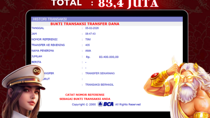 NAGA303 mengucapkan selamat kepada user id : PUT*** yang telah berhasil mendapatkan jackpot pada permainan SLOT DI SWEET BONANZA XMAS . Kemenangan sebesar Rp 83.400.000,-. telah dibayarkan LUNAS oleh pihak naga303 kepada pemilik user id setelah yang bersangkutan mengisi formulir withdraw. Proses pencairan dana berlangsung sangat cepat hanya dalam waktu 6-11 menit sudah berada dalam rekening pemilik user id. Bukti transfer yang dapat anda lihat adalah bukti SAH / VALID yang langsung di dapatkan melalui bukti transaksi dari Bank yang digunakan untuk pengiriman dana pada rekening pemilik user id. Terima kasih kami sampaikan kepada para pengguna setia naga303 yang telah menggunakan situs kami, sebagai Bandar Terpercaya yang pastinya membayar semua kemenangan member hingga lunas. Apakah Naga303 PENIPU ? Reputasi “NAGA303 TERPERCAYA” sudah sangat melekat. puluhan hingga ratusan ribu pengguna setia NAGA303 tetap menggunakan situs terbesar dan terbaik di Indonesia ini. Hapus rasa was-was dan khawatir anda, kemenangan anda berapapun PASTI dibayarkan hingga lunas.