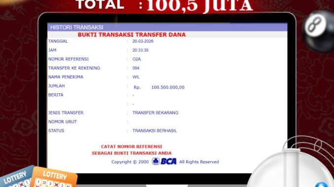 NAGA303 mengucapkan selamat kepada user id : SUK*** yang telah berhasil mendapatkan jackpot pada permainan TOGEL DI JAKARTA 5D. Kemenangan sebesar Rp 100.500.000,-. telah dibayarkan LUNAS oleh pihak naga303 kepada pemilik user id setelah yang bersangkutan mengisi formulir withdraw. Proses pencairan dana berlangsung sangat cepat hanya dalam waktu 6-11 menit sudah berada dalam rekening pemilik user id. Bukti transfer yang dapat anda lihat adalah bukti SAH / VALID yang langsung di dapatkan melalui bukti transaksi dari Bank yang digunakan untuk pengiriman dana pada rekening pemilik user id. Terima kasih kami sampaikan kepada para pengguna setia naga303 yang telah menggunakan situs kami, sebagai Bandar Terpercaya yang pastinya membayar semua kemenangan member hingga lunas. Apakah Naga303 PENIPU ? Reputasi “NAGA303 TERPERCAYA” sudah sangat melekat. puluhan hingga ratusan ribu pengguna setia NAGA303 tetap menggunakan situs terbesar dan terbaik di Indonesia ini. Hapus rasa was-was dan khawatir anda, kemenangan anda berapapun PASTI dibayarkan hingga lunas.